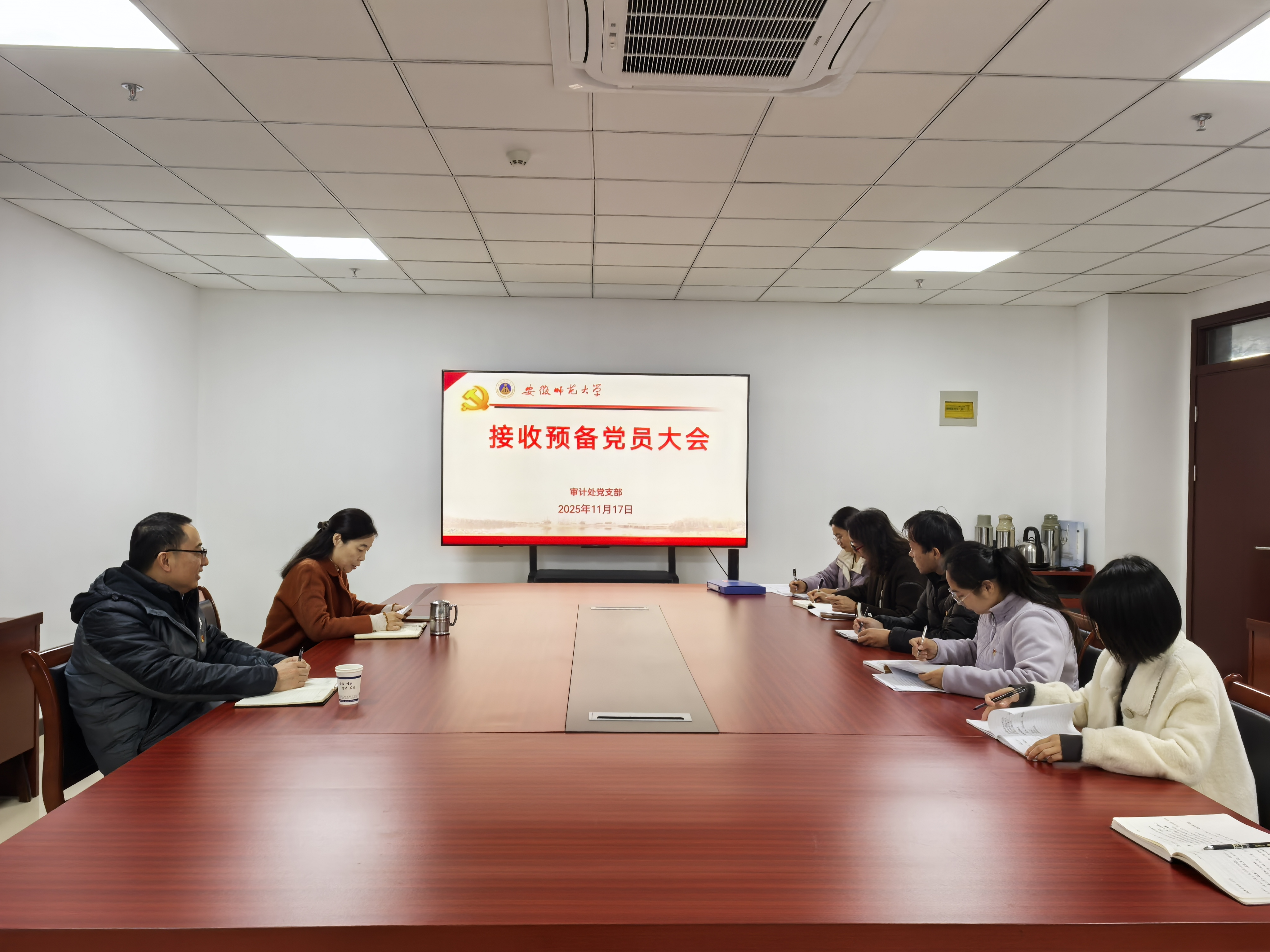 11月17日下午,审计处党支部召开支部大会,讨论接收贺婷同志为中国共产党预备党员。会议由党支部书记喻娜主持,机关党委书记汪俊武到会指导。