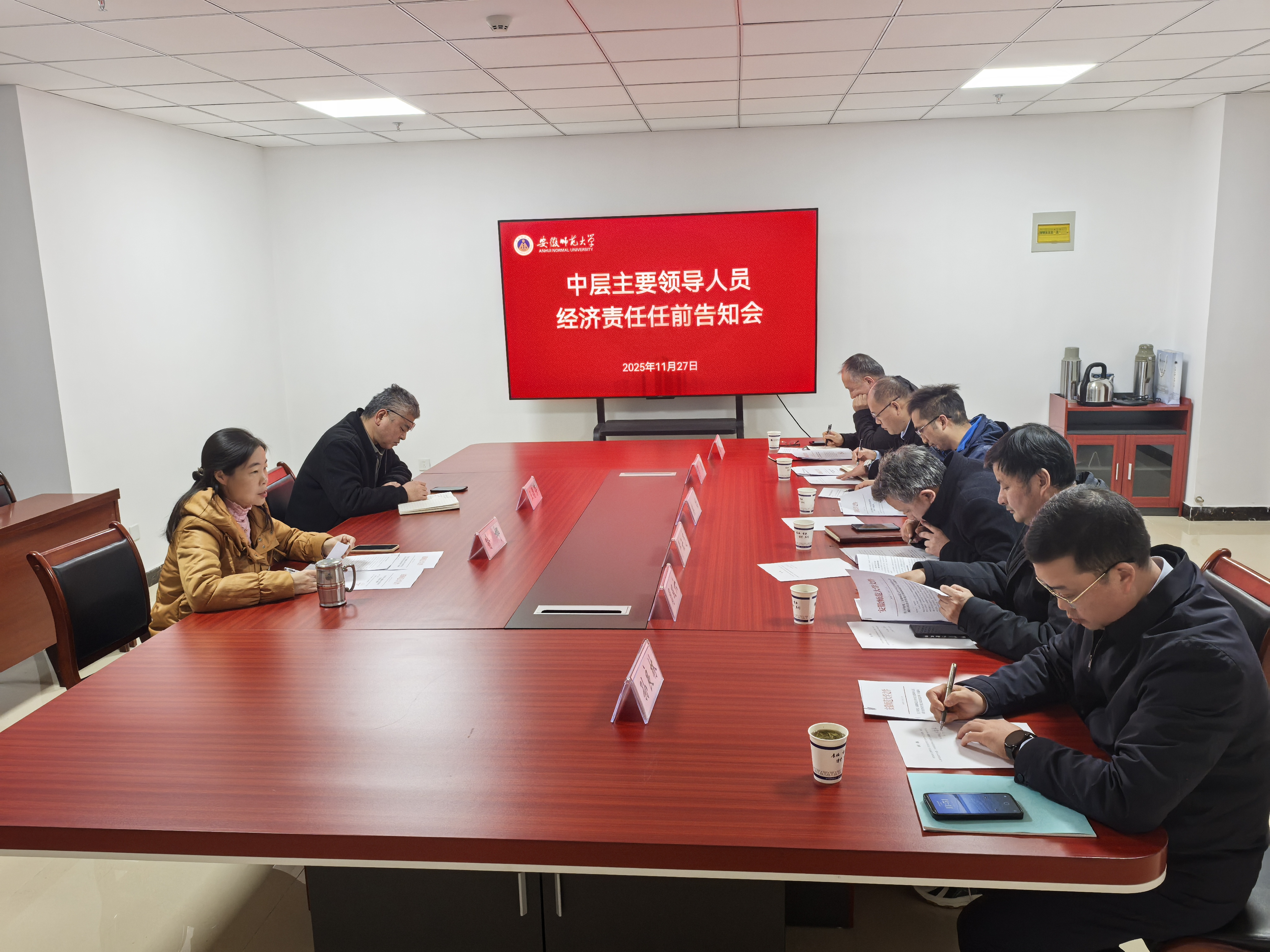 会议传达了十二届校党委审计委员会第一次会议精神,向参会人员发放了《安徽师范大学中层主要领导人员履行经济责任重点风险防范清单》《安徽师范大学经济责任告知办法》等学习材料。